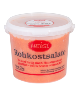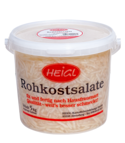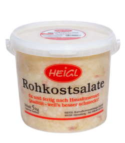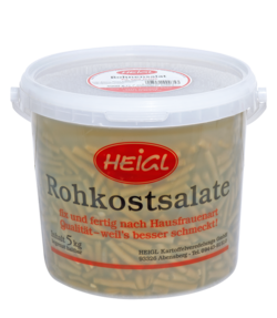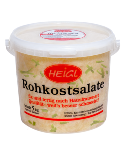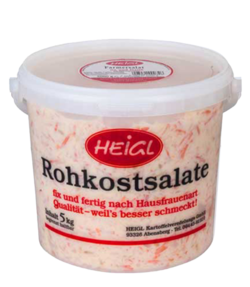 Unsere Rohkostsalate liefern wir in praktischen, wiederverschließbaren 5-kg-Stapeleimern, die gegenüber üblichen Salaten in Gläsern und Dosen das Lagern vereinfachen.